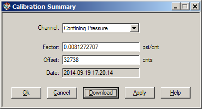 After saving the calibration parameters, check to be sure the Factor and Offset values on the Calibration Summary window (see Figure 6) are the same as those on the Calibrate Confining Pressure window.