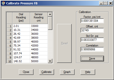 Click the large Read button on the Calibrate Pressure FB window. A value will appear in the Sensor Reading column. Repeat this procedure for a series of pressure values that covers the range of the pore pressure transducer.
